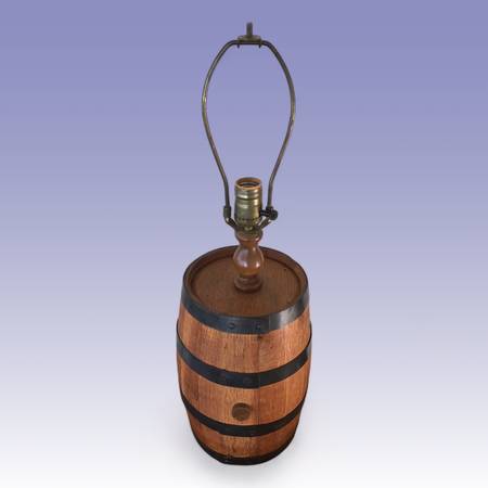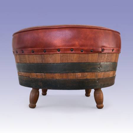 This Vintage Mid Century Modern Whiskey Barrel Set is in good pre-loved condition. It’s made of upcycled maple and oak wood with metal straps, and both chair and ottoman have a riveted upholstered vinyl seat/top. The lamp’s shade is made of fabric. This hard-to-find set is a great conversation piece and will make for a fun set up in a man cave or game room. Made in the US by Vista Industries, Inc. Louisville, KY.