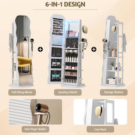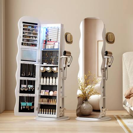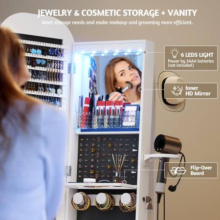 Built-in Lighted Mirror & Makeup Shelf:The interior mirror provides 6 LED beads, making it convenient for you to organize jewelry or apply makeup. The built-in mirror with a flip-over shelf creates a convenient mini "vanity table". Letting you apply makeup and accessorize without closing the cabinet door. Enhanced with LED lights, it's your perfect makeup companion