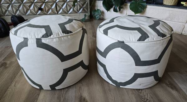 2 beige with black geometric design poufs, $40 for both