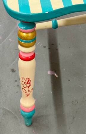 A unique piece that blends whimsy with classic lines of a vintage chair. This vintage wooden chair that’s been given a whimsical, hand-painted makeover originally started as a traditional spindle-back chair, mid-20th century (1940s–1970s), with turned legs and a solid wood seat. The repainting features bold colors (turquoise, pink, cream, and gold), striped patterns, and floral motifs. The painted floral detail and playful stripes give it a Mackenzie-Childs–inspired look, a company famous for whimsical painted furniture with a mix of colors, stripes, and flowers.