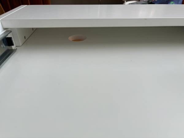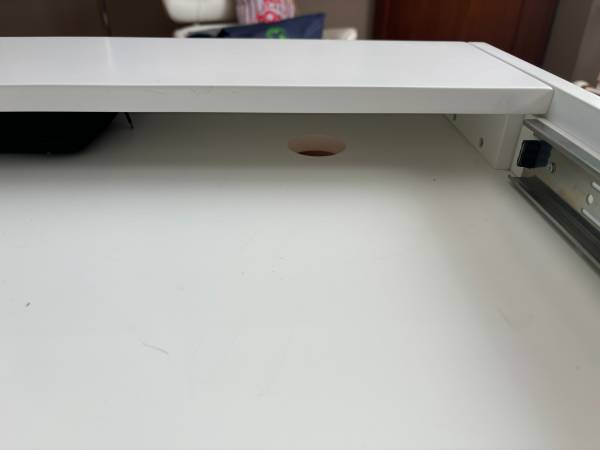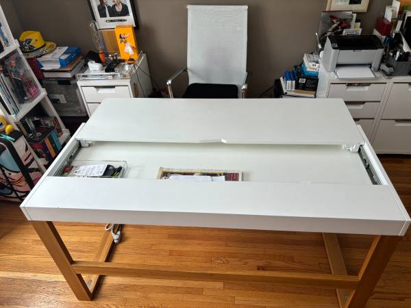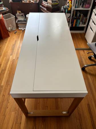 lacquered white 57″ wide by 24″ deep surface sitting on a solid white oak stretcher base appears a traditional desk to most — A gentle slide of its top, reveals a hidden area with nine square feet of stash space designed to quickly conceal books, gadgets and other office detritus. There’s even hidden cutouts for keeping wires neatly in line.