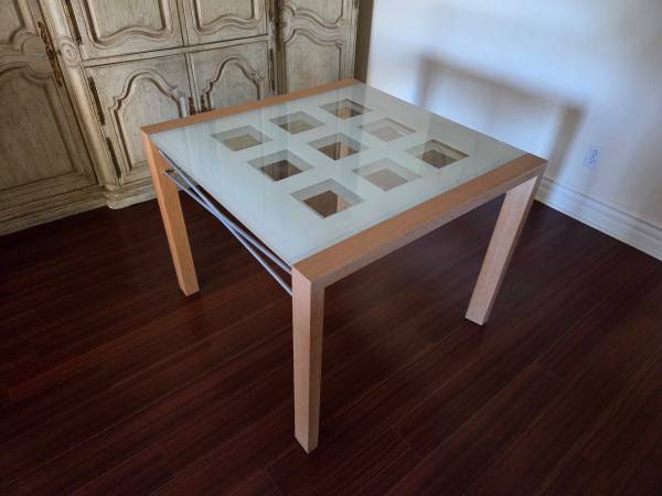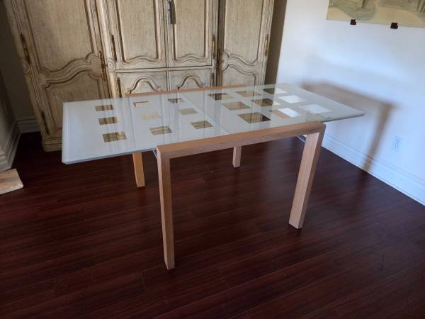 Extensia Expandable glass dining table from French designer Ligne Roset. 67” open, 37” folded (one glass section slides under the other), 29.5” high and 37” total width. Solid maple frame with stainless steel hardware. Excellent condition - there are some surface scratches from use, but it still presents very well. A very nice table with Ligne Rose’s signature frosted square motif on glass.