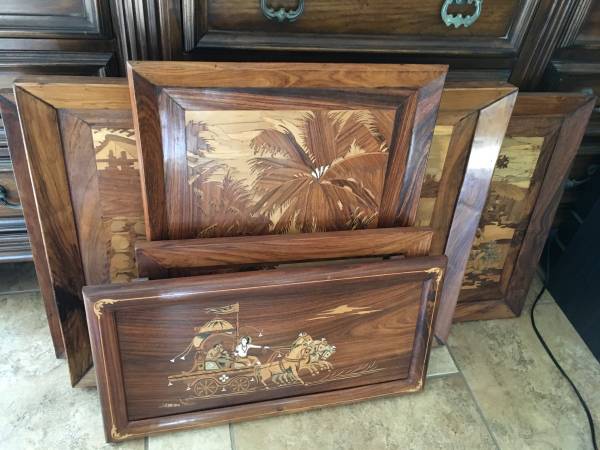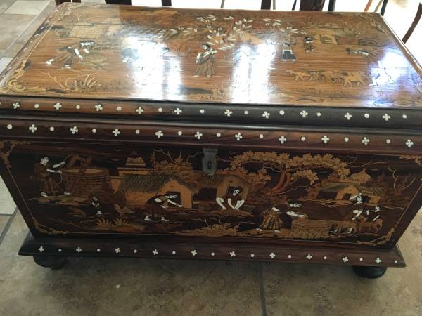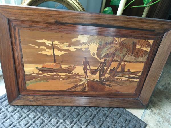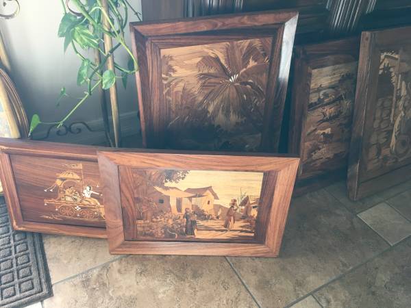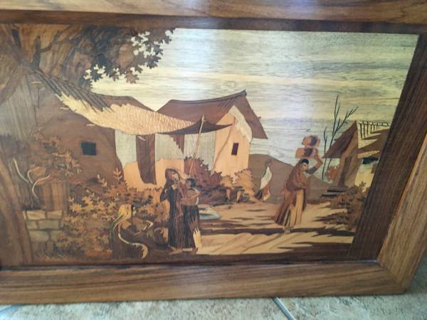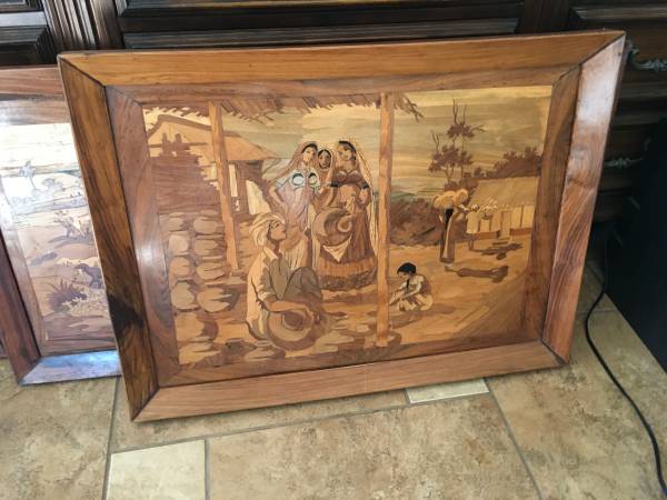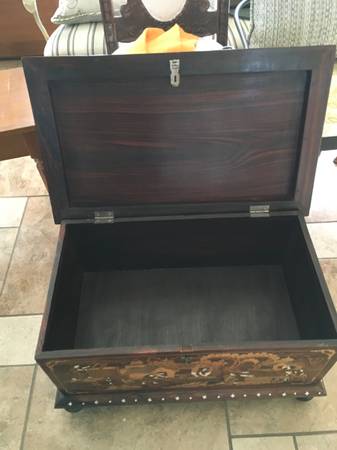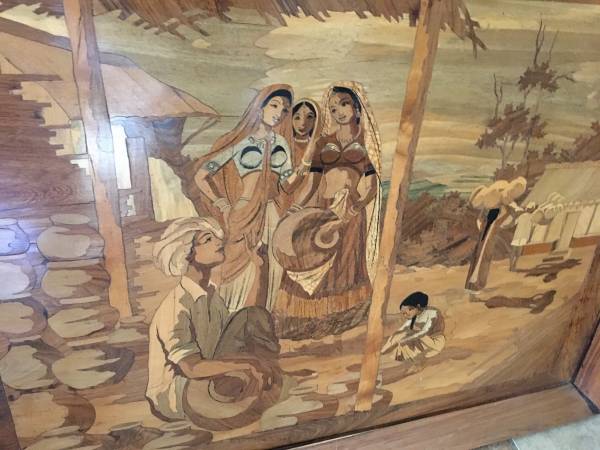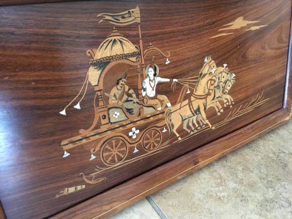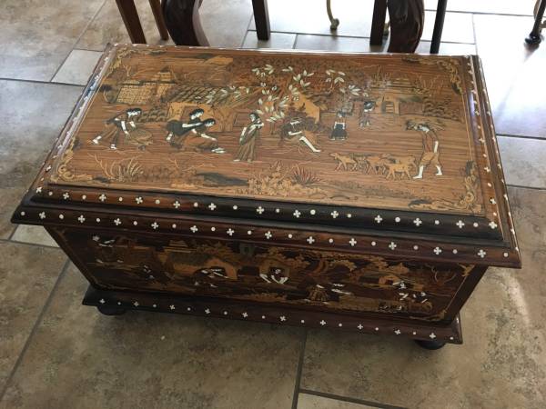 Beautiful original art inlaid wooden trunk in excellent condition, hand crafted and hand made from real authentic different woods ,bone and mother pearl. There are others frame of similar art work. Original India 🇮🇳 about 40-50 years old.