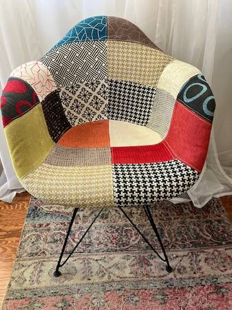 EXC condition, SET of FOUR (4) patchwork upholstered Eames-style Eiffel tower chairs. In dining room, only used a few times, in excellent condition, chairs have stitched multi-color patchwork upholstery, black metal Eiffel Tower base with rubber feet. Please see photos for measurements and description/condition. Paid $400/each for chairs, selling set for a fraction because of downsizing.
