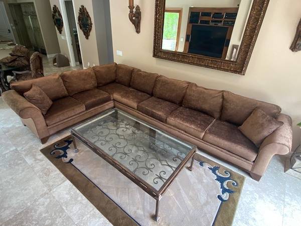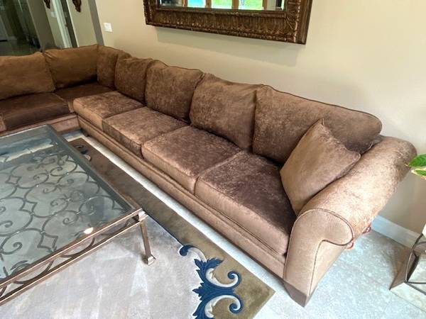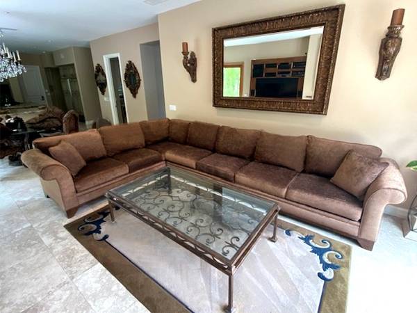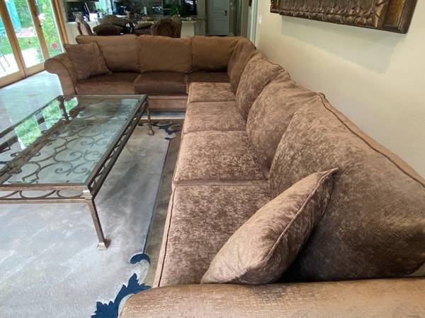 This is an AMAZING one-of-a-kind, custom-built sofa, which I specifically created to "stage" a 5-million dollar home, to help get the house sold fast. The fabric alone cost over $65 per yard, and the entire sofa cost over $10,200 to have made. The original plan was to sell it with the house, but the new owners already have their own sectional sofa that they plan to use instead.