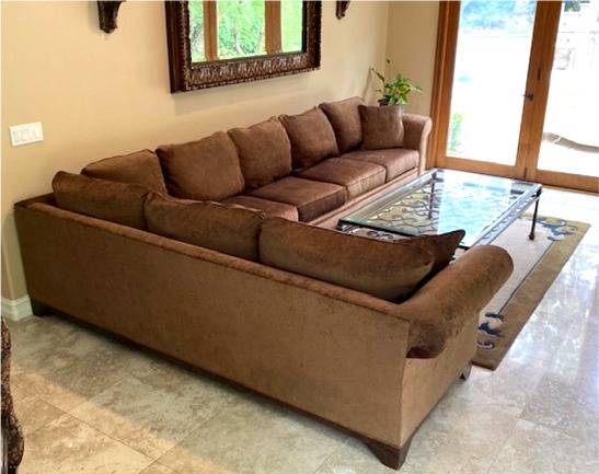 Since this sofa was only used to stage a home, it is basically brand new. There was never any pets or smoke around it. It was never eaten on, and it was never even sat on for more than 5 minutes, for a period of only 30 days. So you'd basically be getting a $10,000 large sectional sofa for close to a quarter of its real value.