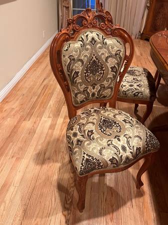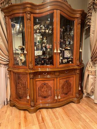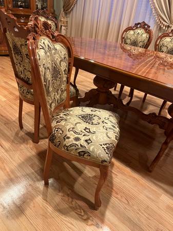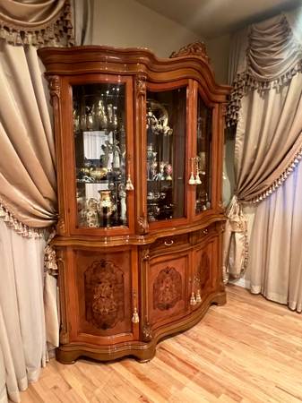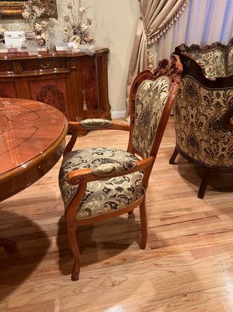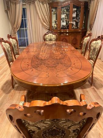 Original Regina Italian Dining set - table with extension that sits 12 chairs and the original Regina Italian China cabinet. Real Italian wood. Items in China Cabinet NOT INCLUDED. 2 armchairs and 10 standard chairs. Set is original value $16,000. Price negotiable. CASH ONLY. Both also offered separately.