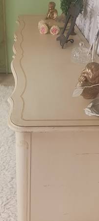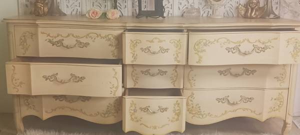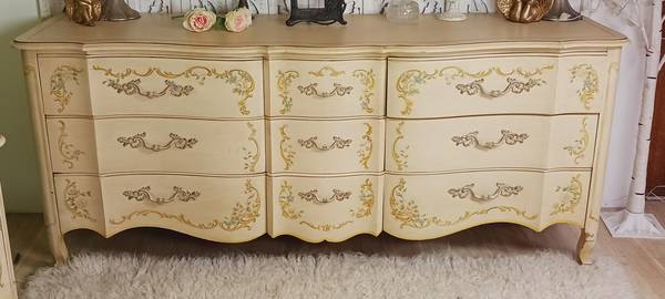 Beautiful decorative floral.oanted front drawers.ample drawers with divinsions on the top ones. Smaller center drawers for lingerie and such...