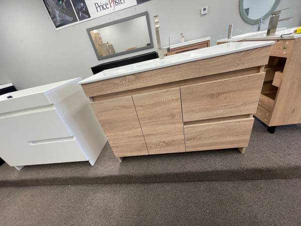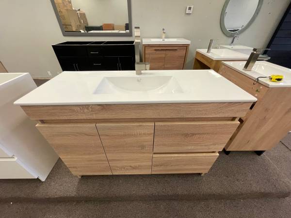 Brand new No damages 48” and depth of 18.5” Porcelain top Brand new porcelain countertop Sleek design In white oak color Lots of space Plumbing ready Nobody beats my prices!