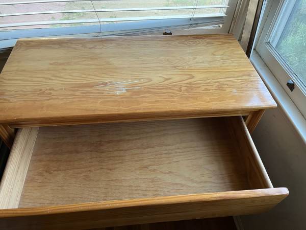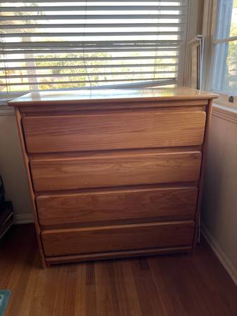 Very solid all wood bureau. We used it in our kid's room. Has one scratch up top and the bottom drawer pulls out smoothly but titls a bit when pulled all the way out. I'm sure someone handier than...