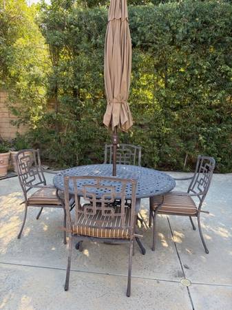 54" Round Table, 29" high, with umbrella and umbrella base Four chairs with cushions Each chair is 26" wide, 23" deep, 20" seat height Wrought Iron, very durable and solid