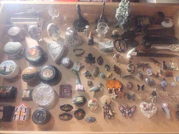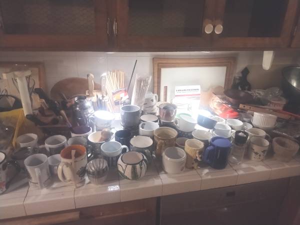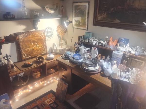 Many of the new items available consists of a bigger selection of costume jewelry, necklaces, pins and broaches and related accessories; a signed photo from the TV series “Mr. Belvedere” featuring an autograph of Bob Ucker; an assortment of collectable decorative ceramic and glass figurines; a classic style oak buffet; an antique bureau; a Danish modern style buffet; an eight chair dining room table; framed wall pictures of various sizes; classic floor rugs of various sizes and styles; a sturdy cream colored leather upholstered full sized couch; cooking pots, pans, trays, and utensils with table top kitchenware manual and electric appliances; a pair of vintage Wharfedale W70 floor speakers, various practical and fancy dinnerware sets; a collection of Swan based figurines and decor; office supplies of all kinds;; a pair of sewing machines; multimedia electronics; hard and soft cover books featuring multi-book collections from Time-Life Publications; a full sized billiard table with multiple cue sticks and billiard accessories; poster art featuring a collection of signed lithographs by artist Andre Balyon; artistic tiles and tile grinding equipment and related art supplies; a 48” Panasonic LCD TV; outdoor patio sets; a Traeger barbecue with smoker attachment and BBQ utensils; outdoor potted plants of various sizes with garden accessories; hand and power tools: a pair of touring bikes: men and woman’s clothing; towels, linens, blankets, and bedding; a full length programmable heated body masseur; three vintage wedding dresses and related outfits; vintage Christmas decorations; a huge library of single and boxed collections of classical, folk, and easy listening music vinyl records: an acoustic and electric guitar with case; A collection of flutes and other small hand held musical instruments; a vast library of sheet music books and MORE!