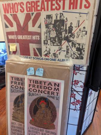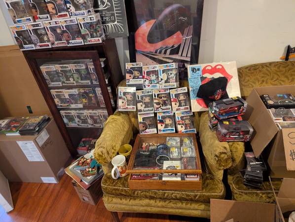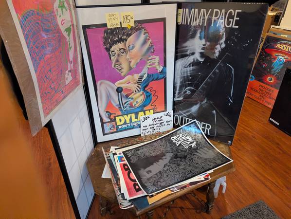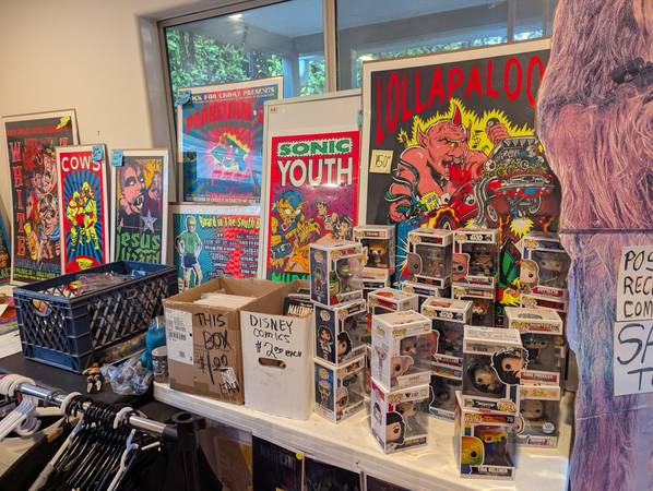 Comic books, vinyl records, T-shirts, baseball caps, horror and other action figures, posters, framed and unframed and shrink wrapped movie posters from the 1950s to 2000s and concert posters and band posters from 1960 through 1990, plus video games, graphic novels, and bobbleheads