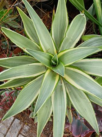 The rare Agave 'Joe Hoak' (Agave desmettiana 'Joe Hoak') forms a striking rosette to about 2-3 ft. tall by 3-4 ft. wide. The graceful 2 ft. long leaves, which curve upward and then out, are striated with stunning pale gray green and cream colors. It has a strong green margin on the lower half of the leaf. The small well-spaced marginal spines and the 1/2-inch terminal spine are reddish brown.