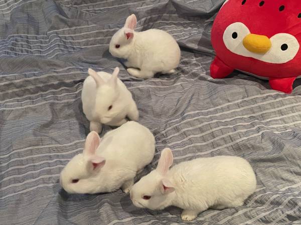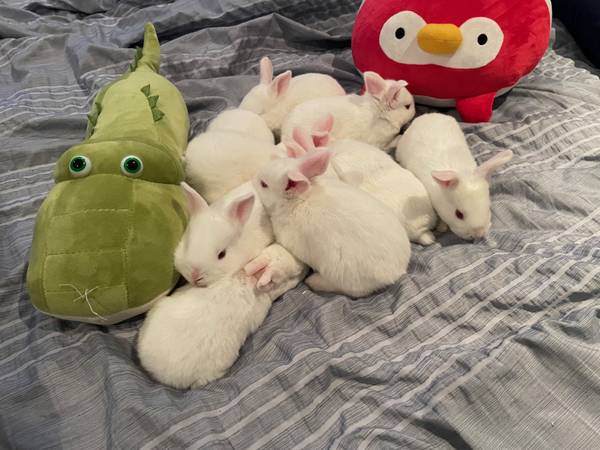 Baby bunnies are pure white New Zealand and TAMUK rabbit, rehoming fee to deter adopters with bad intentions.