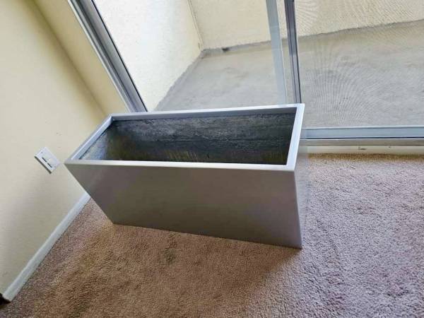 Please call Fibreglass silver planter box Indoor/outdoor - perfect for offices No drainage holes 35.5” length x 14” depth x 16.5” height