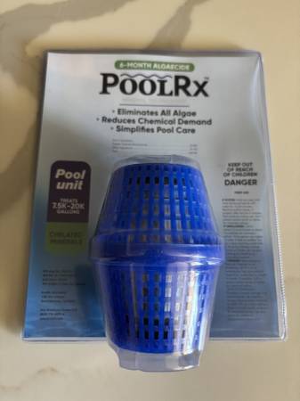 POOL RX ALGACIDE AND MINERAL PURIFIER BLUE BRAND NEW AND SEALED. I GOT THIS COUPLE OF MONTHS AGO PAID $75.00 + TAX BUT ENDED UP NOT USING IT. GREAT PRODUCT TO ADD TO YOUR POOL PUMP TO ELIMINATE...