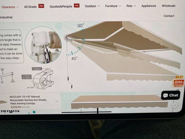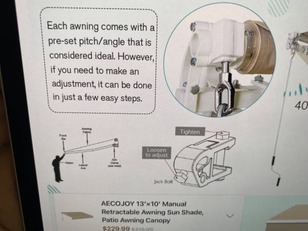In original box, brand new never used , it was wrong size. It extends and retracts manually and has three angles levels. Beautiful Tan Beige color very neutral, matches many earth tones or contrast. Paid more for it, you gain is my loss.
