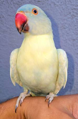 The ringneck is 8 months old now. Harlequin Indian ringneck was hand-raised but needs to be handled more often to stay tame.