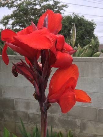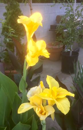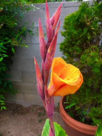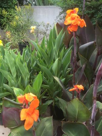 Tall tropical canna lilies in three color combinations: YELLOW AND RED and ORANGE.