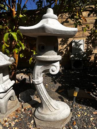 This Lantern is made of Portland cement, measures 36"H x 18"D. This large Rankei Japanese Pagoda Lantern is unique with its arched support column creating a cantilever for the light house. Traditionally, the lantern is installed so that it extends over a pond or lake creating a reflection in the water but is a nice center piece in any garden or patio. Lanterns are an essential design element in Japanese gardens and add a sense of tranquility to any exterior space. It is predrilled for electrical lighting. Can give discounts for multiple purchases also have other Buddha and pagoda, lantern, dragon, turtle, fountains etc. If interested please reply and I can send phone number