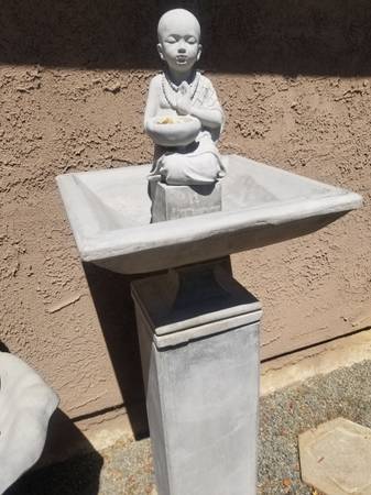 Cement water fountain. Measures about 4 feet. Beautifully designed fountain will undoubtedly beautify your garden or patio. Hoses and pump included in price.