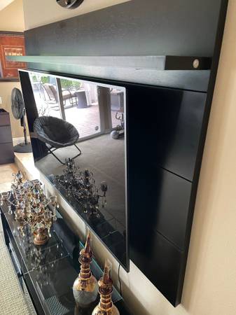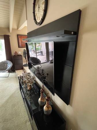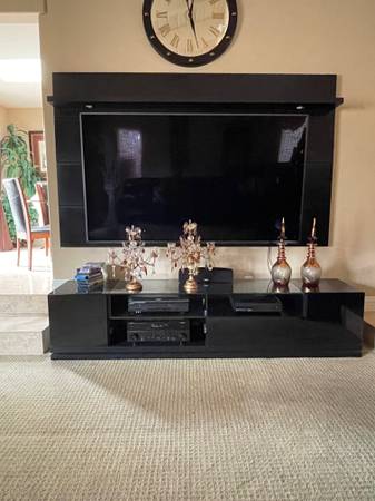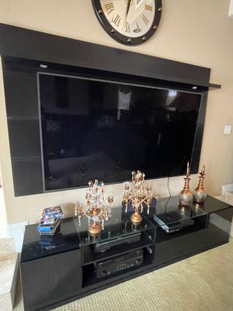 This modern black entertainment center features a sturdy wall-mounted panel perfect for a large TV 75" or larger, a center console with two drawers and two side-door cabinets for storage, Shelving on top of TV and a stylish glass top section in the middle. It's a complete, elegant setup ready to enhance your living room. Base width 86" including the top back board and shelf