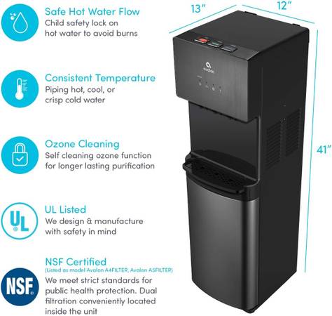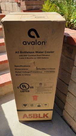Avalon self-cleaning bottles water cooler and dispenser model A5BLK in black stainless steel color. It can be used inside and hooked up to the sink or refrigerator line, and also can be used outside and hooked up to bibb or spigot line. For more info on the cooler google the model number or check out manufactures web site. Dispenser is brand new never been used in it's original box. $225 cash and pick up only no exceptions. I will not communicate by e-mail for more info please call or text 323fiveninfiveeight715