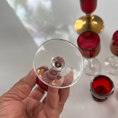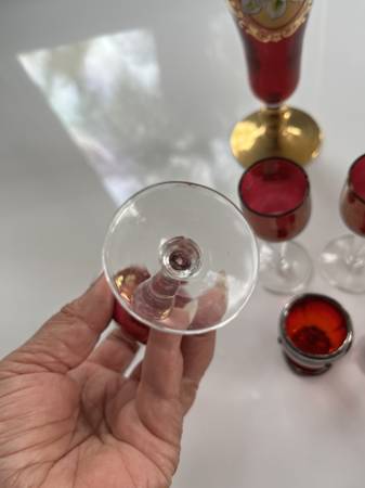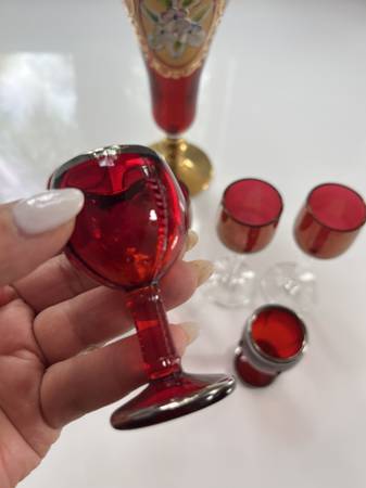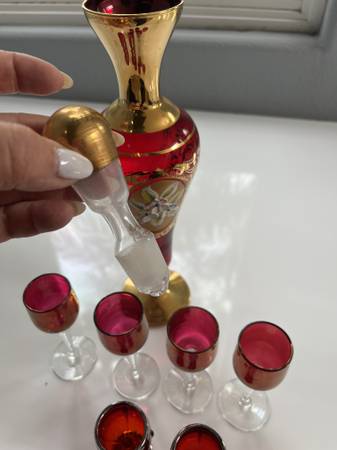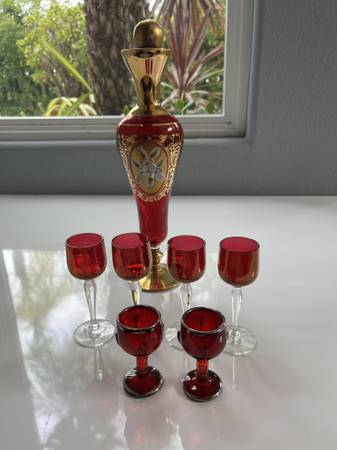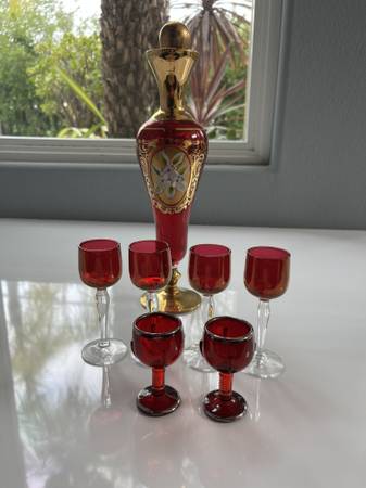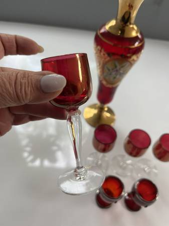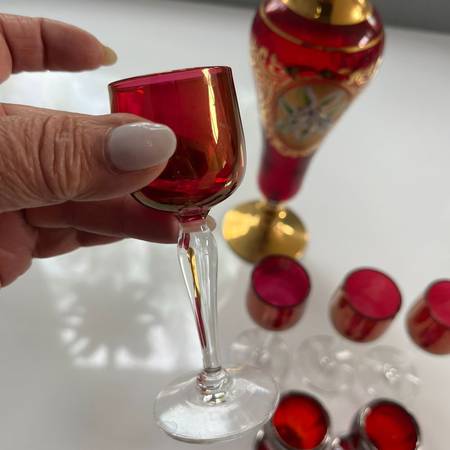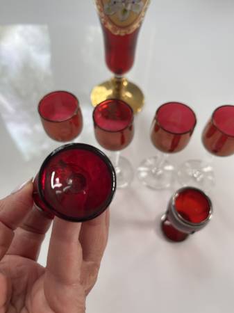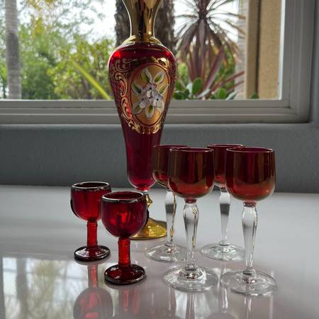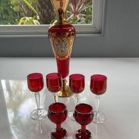 Venetian Murano Red Glass Decanter Vintage Venetian Murano Italian Red Glass 18K Gold Overlay Decanter Set Here's your rare chance to own a beautiful red Italian Decanter and 6 aperitif glasses at...