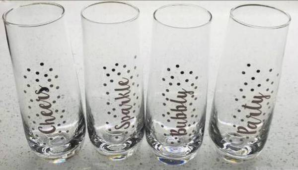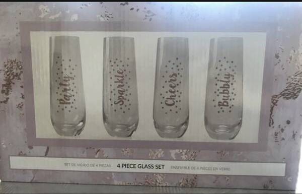 4 Piece Glass Set -Brand new in box -The following words are printed on each glass: Party, Sparkle, Cheers, and Bubbly (one on each glass) -Clear glass with pink color print
