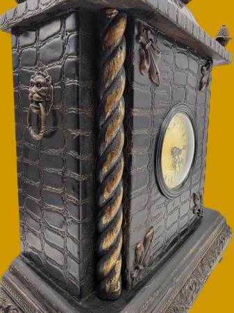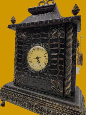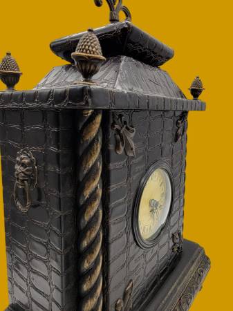 This vintage-style 90s mantel clock adds old-world charm with its faux crocodile texture, ornate brass London lion knockers accents, and Roman numeral dial for a classic timepiece.