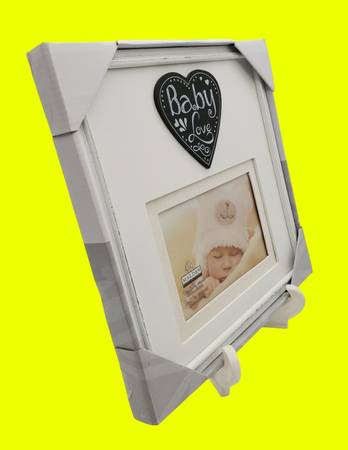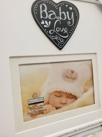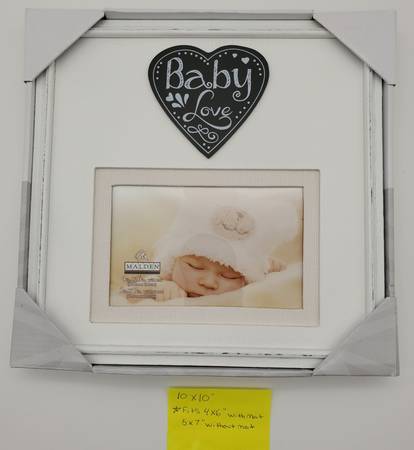 A beautiful frame to preserve life's special moments with style! Malden International Designs Rustic Woods Distressed White with Silkscreened Baby Love on Heart Attachment with Linen Mat Picture Frame, 4x6/5x7.