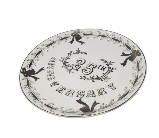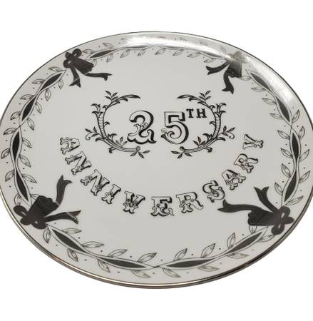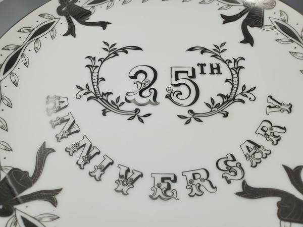 - Hand-Painted Plate Features: 25th Anniversary White Lefton China Porcelain Plate, Silver Wedding Bells, Silver Ribbons, Leaf Design and Silver Rim Around the Plate, Stamped 285 with Red Label Lefton's Exclusives Japan, Reg US Pat Off