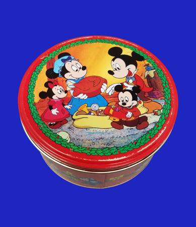 A charming storage solution featuring a festive Disney Mickey and Minnie Mouse family design. Ideal for small keepsakes, holiday treats, or display. Durable and decorative.