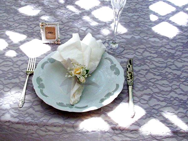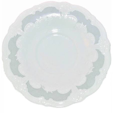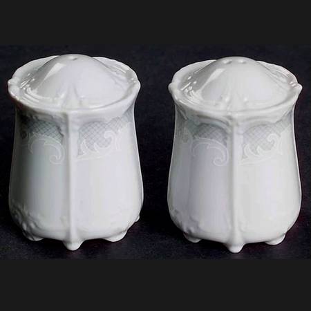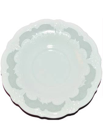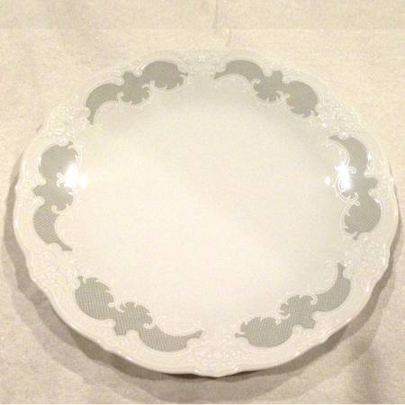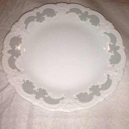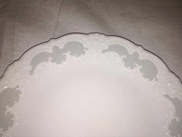 This porcelain china was put out by the Rosenthal collection of the Waterford / Wedgwood Company and it is specifically called "Orleans Baronesse" from the Hutschenreuther line. It is a bright, shiny white background with fine, raised details, and it is accented in medium gray areas that look like lace on the plate. So elegant and simple. Something you can live with and love for a lifetime because it is classic and never goes out of style.