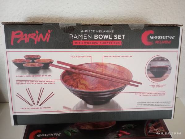 Title: Ramen Bowl set with wooden chopsticks Parini 4 piece melamine Brand: Parini Bowl Set: 4 piece Wooden Chopsticks: 4 piece Material: melamine* Made: in China * Melamine is a type of plastic,...