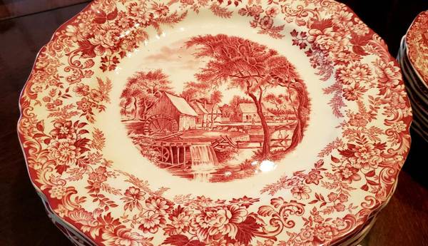 VINTAGE JOHNSON BROS. "MILL STREAM" TRANSFERWEAR PLATES. RED AND WHITE AND PERFECT SHAPE! MIX AND MATCH WITH OTHERS! 8 EACH: DINNER PLATE SAUCER BREAD PLATE CASH AND PICK UP ONLY! A GREAT PRICE FOR...