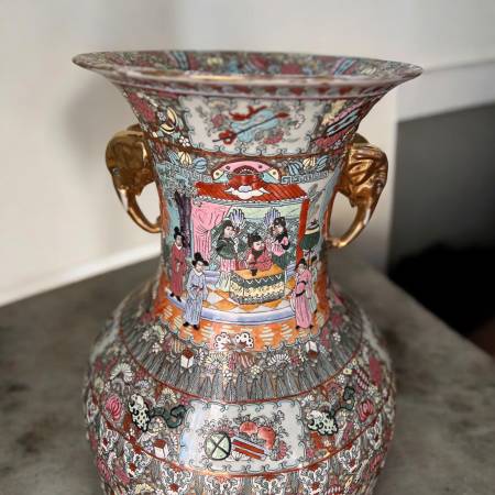 Chinese Famille Rose vases, antique Canton porcelain, vintage baluster planter, Asian decorative ceramics, hand-painted Chinese vases, traditional oriental décor, collectible porcelain pair, luxury vase decor, gilded Chinese urns, vintage chinese vase,
