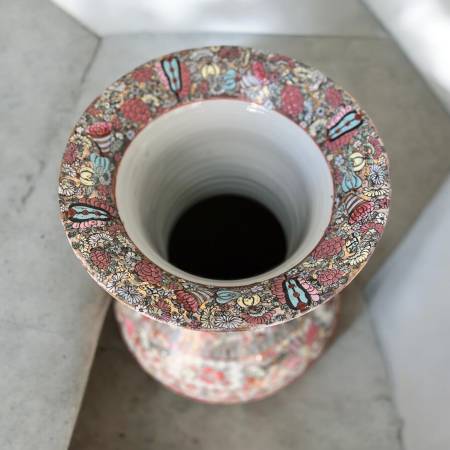 - **Design**: Decorated with detailed panels depicting dignitaries in palace garden settings, along with beautiful vignettes of butterflies and flowers. The trumpet neck is similarly adorned and flanked by a pair of elegant elephant head handles. The vase is set against a background densely strewn with flowers and Precious Objects, exuding opulence and refinement.