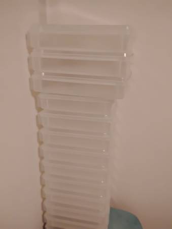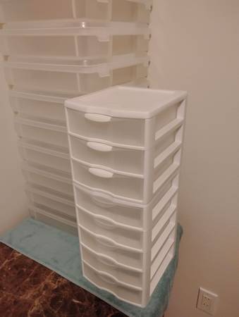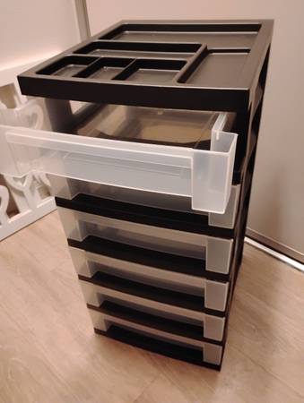 3 clear storage containers with drawers, each with 6 divided compartments, from the container store.