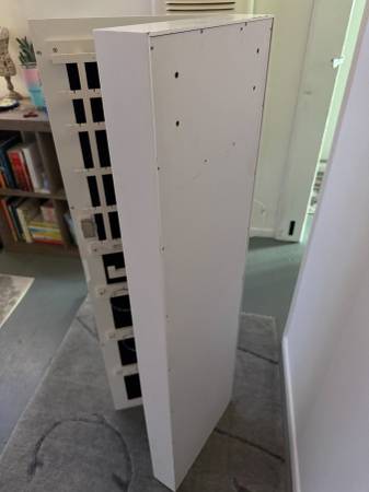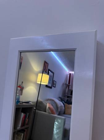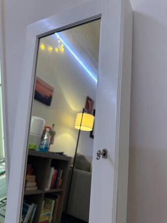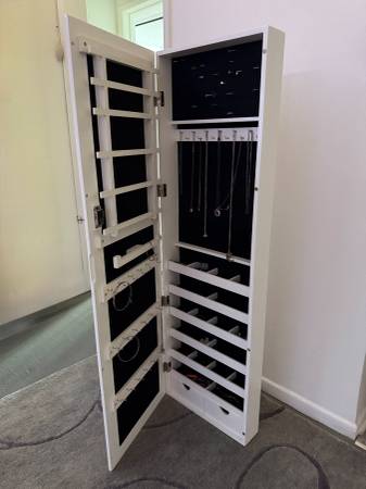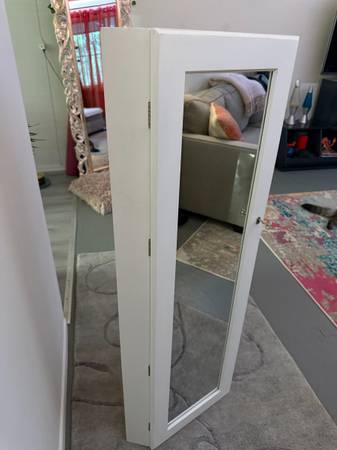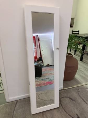 Lockable over-the-door or wall-mounted jewelry cabinet mirror with a full-length glass front and spacious interior storage. Includes necklace hooks, earring slots, ring holders, shelves, and two drawers for extra organization. Features a working lock and comes with the original key (shown in photos).
