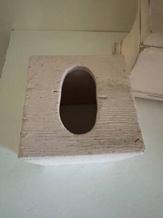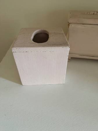 Tissue box holder is painted the same soft pink and is open on the bottom, which is where you put the tissue box. Measures 6x6x6.