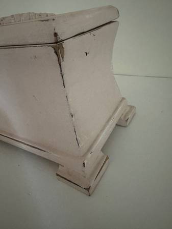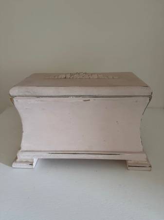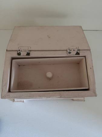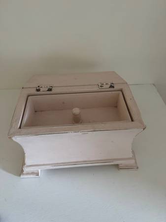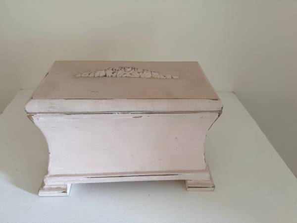 The jewelry box has a rose Applique on top and the lid is hinged. There is a removable jewelry tray on the inside and storage underneath. Painted a soft pink which is distressed and faded from years gone by. Measures approx. 12.25” wide x 7.25 deep x approx. 7.50” high.