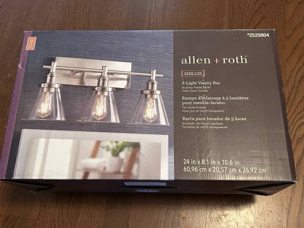 Brand new in the box untouched Allen and Roth Shiloh 24 inch 3 light brushed nickel vanity light bar Purchased from Lowe’s, didn’t use, too late to return it.