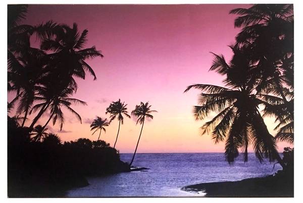 We used these one time for a "Luau Beach Themed" party. We paid $69 for one and $54 for the other originally. These can both lean against something or hang on a wall. The one with the pink sky is made of heavy-duty cardboard so it is very lightweight, the one with the blue sky is more like a canvas with a cardboard backing.