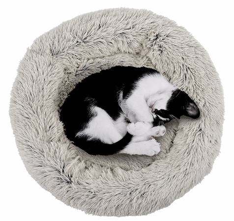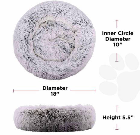 This cozy & soft fun fur bed can hold all pets from size 2 -15 pounds. It's round shape encircles the pet with warmth and make them feel secure and calm. The fun fur has strands of light gray and white.