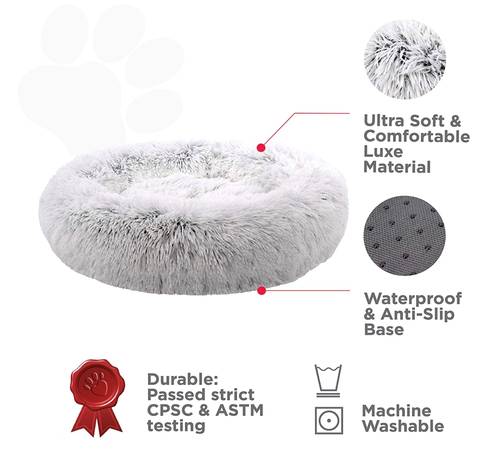 This bed is Fluffy and luxurious in a round donut shape. The bottom fabric has anti-slip silicone grips to help keep the bed stationary. This fabric is also waterproof to help keep your floors or kennel clean in case your fluffball has a mid-snooze accident.