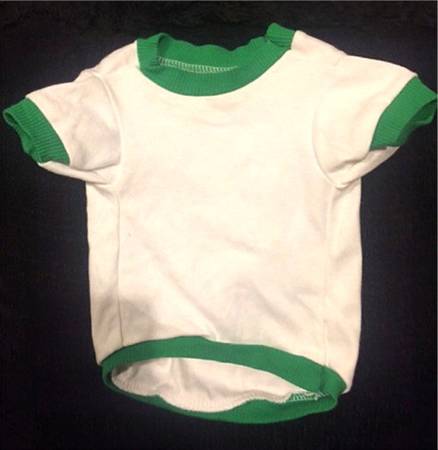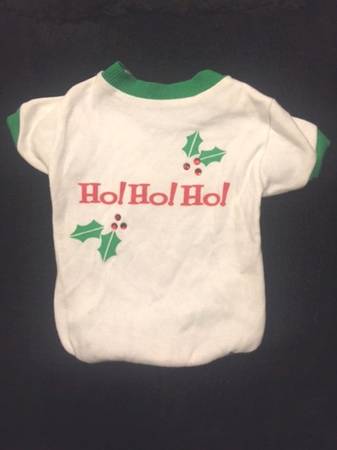 Adorable tiny white shirt in washable cotton with bands of green ribbed trim around the neck, arms and bottom. Says "Ho! Ho! Ho!" in red and has green holly leaves and red berries on it. Perfect for your Xmas Pup or Cat!