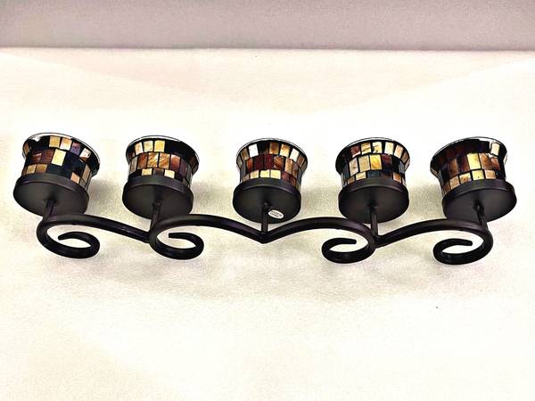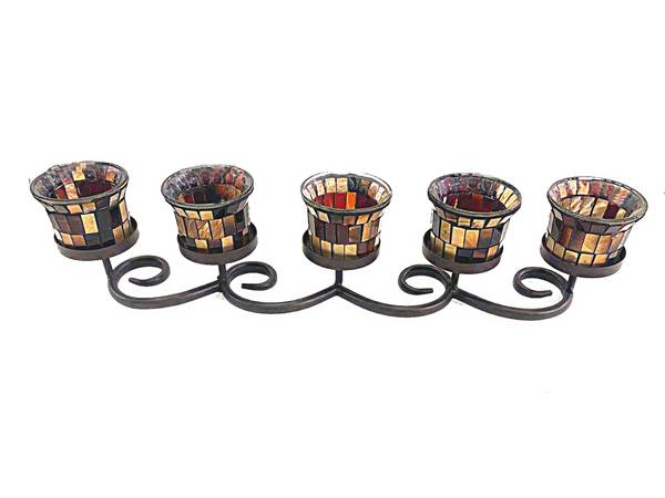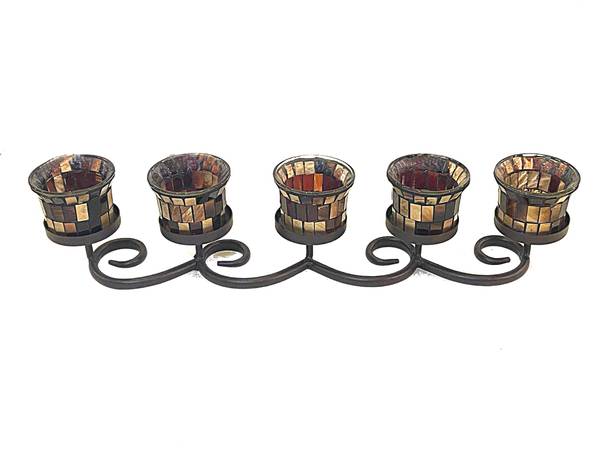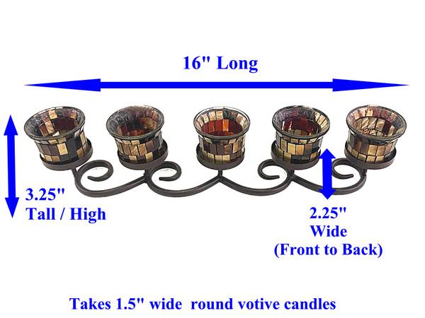 You can see many of the items for sale in the listing photos here, in addition to the first 6 photos of the ONE item for sale in this listing, which is a beautiful 5-Votive Candle Holder. It measures: 16" Long / 2.5" Deep / 3.25" Tall. Each of the 5 cups can hold a 1.5" round votive or small candle. When the light hits the mosaic cups all of the little squares of color really shimmer. It has shades of gold, bronze, brown, etc.