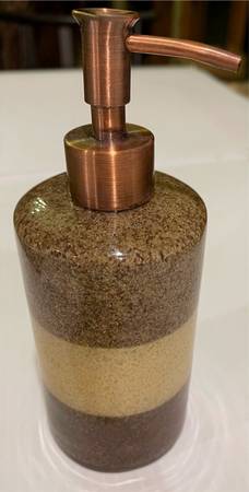I have this heavy duty, pump-top soap dispenser for sale. It is made of genuine stone (marble) in shades of a light taupey brown and tan. The top is a rose gold metal. Holds A LOT of liquid soap so you seldom have to refill the bottle.